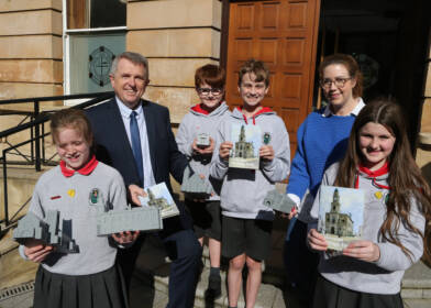 Working in partnership with Primary 7 pupils from D.H. Christie Memorial Primary School, the project has produced a beautifully illustrated guide showcasing more than 20 of Coleraine’s historic buildings. The guide features watercolour images inspired by illuminated addresses held in the collections of Coleraine Museum, the Honourable The Irish Society and Libraries NI, alongside historic photographs from the collections of Robert Anderson and Sammy Walker.