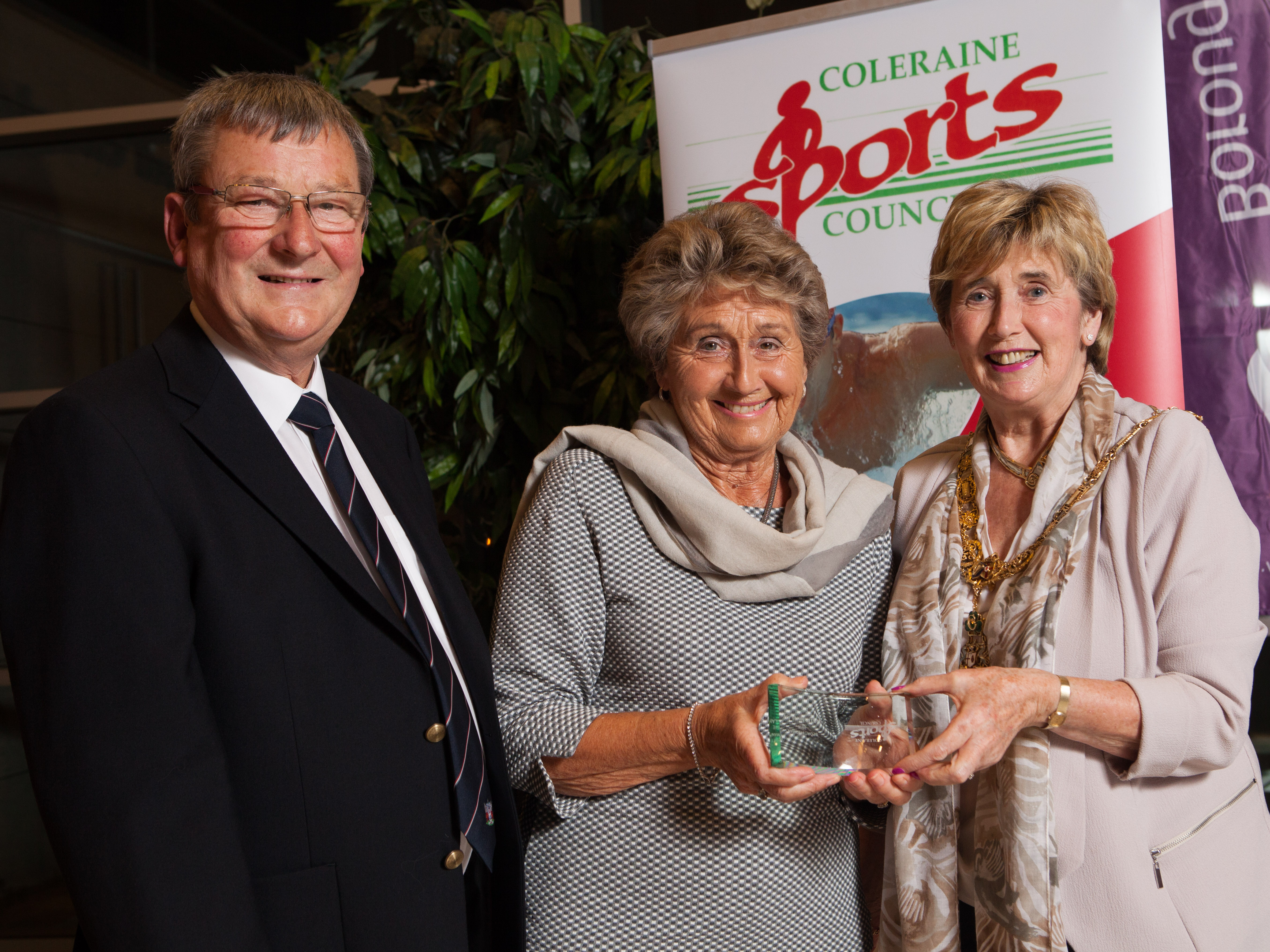 Joy Kearney accepts the Sportswoman of the Year award on behalf of her granddaughter Katie Mullan from Hugh Wade, Chairman of Coleraine Sports Council and the Mayor of Causeway Coast and Glens Borough Council Alderman Maura Hickey.