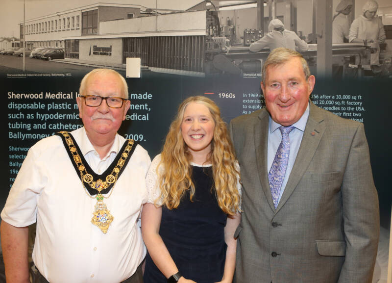 Mayor of Causeway Coast and Glens, Councillor Oliver McMullan, pictured alongside Museum Officer Jamie Austin and past Sherwood Medical Ballymoney Manager Albert Sherrard at the launch of the Sherwood Medical Exhibition in Ballymoney Museum.